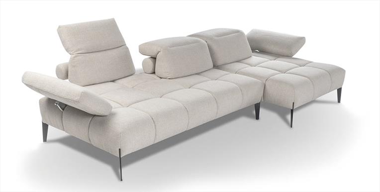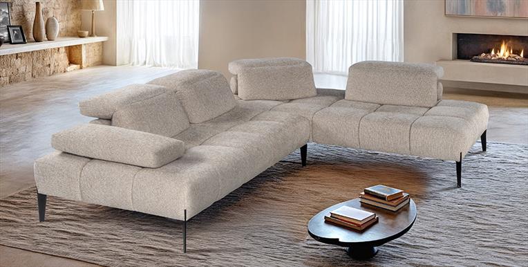 Highline is a contemporary sofa distinguished by its compact seating, enhanced by a quilted effect. Elevated 19 cm off the ground, it features a continuous headrest integrated into the backrest and adorned with a bolster. The manually adjustable backrests and armrests, thanks to a tilting mecha-nism, extend the seat depth by 42 cm and the armrest width by 22 cm each.